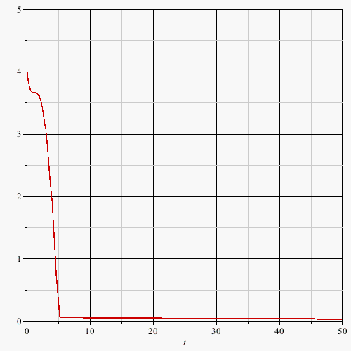 p1 := odeplot(ansnum, [[t, sqrt((x(t)-X(t))^2+(y(t)-Y(t))^2)]], 0 .. 50, color = red, view = [default, 0 .. 5])
