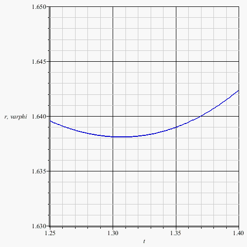 plots[odeplot](soln, [[t, r(t)], [t, `&varphi;`(t)]], 1.25 .. 1.4, color = [red, blue], view = [default, 1.63 .. 1.65])