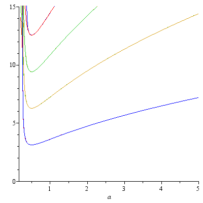 p2 := plot(eval~(ss, zz =~ [seq(-4 .. -1)]), a = 1/4 .. 5, view=[DEFAULT, 0..15]);