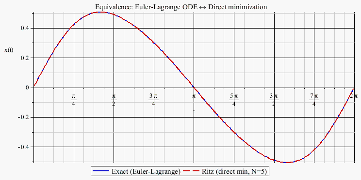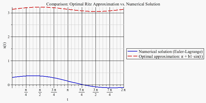 # Goal: Minimize J using trial function x(t) = a0 + b1 sin(t)  (Ritz method)