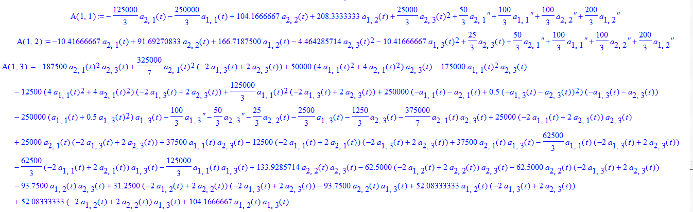 eq2 := 47619047.62*(-6*a[2,3](t)+6*a[3,3](t))*a[3,3](t)+142857142.8*a[3,3](t)*(-3*a[2,3](t)+3*a[3,3](t))+266666666.8*(-2*a[1,3](t)+2*a[2,3](t))*a[3,3](t)-16666666.67*(-6*a[2,3](t)+6*a[3,3](t))*(-3*a[2,3](t)+3*a[3,3](t))-25000000.00*(-2*a[1,3](t)+2*a[2,3](t))*(-3*a[2,3](t)+3*a[3,3](t))-25000000.00*(-6*a[2,3](t)+6*a[3,3](t))*(-2*a[1,3](t)+2*a[2,3](t))+300000000.0*a[3,3](t)*a[1,3](t)-41666666.68*(-6*a[2,3](t)+6*a[3,3](t))*a[1,3](t)-83333333.32*(-2*a[1,3](t)+2*a[2,3](t))*a[1,3](t)+166666666.7*a[1,1](t)+83333333.32*a[2,1](t)+50000000.00*a[3,1](t)+2227361110.*a[1,2](t)+1113680555.*a[2,2](t)+637573412.7*a[3,2](t)+1072222222.*a[2,3](t)+1072222222.*a[3,3](t)-428571428.5*a[3,3](t)^2-41666666.68*(-2*a[1,3](t)+2*a[2,3](t))^2+.9357142857e-5*diff(a[3,2](t),`$`(t,2))+.1637500000e-4*diff(a[2,2](t),`$`(t,2))+.3275000000e-4*diff(a[1,2](t),`$`(t,2))-.9357142858e-3*diff(a[3,1](t),`$`(t,2))-.1637500000e-2*diff(a[2,1](t),`$`(t,2))-.3275000000e-2*diff(a[1,1](t),`$`(t,2))