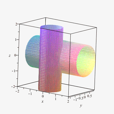 cyl:=implicitplot3d([cylx,cylz], x=-2..2, y=-2..2, z=-2..2,