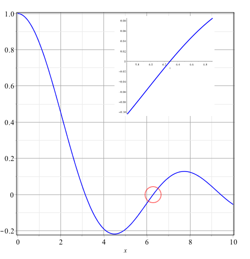 plot(sin(x)/x, x=0.9*Pi*2..1.1*Pi*2, color=blue, thickness=4);