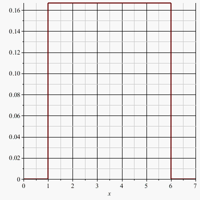 piecewise(x < 1, 0, x <= 6, [1/6, 1/6, 1/6, 1/6, 1/6, 1/6][floor(x)], 0)