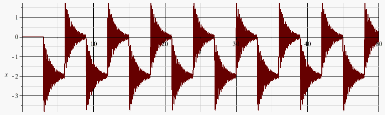 sol_num := dsolve({value(doe),   x(0)=0, D(x)(0)=0  }, numeric, maxfun=10^6, method=rosenbrock, range=0..50);