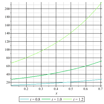 eval(v(t), y=2), x=0.101..0.709, legend=typeset('t'=t)