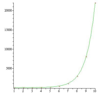 > Y:=<3.7,9.39,23.09,58.60,153.41,409.43,1103.63,2988.98,8112.08,22036.47>: