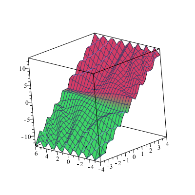 > plot3d(fexpr,-4..4,-6..6,axes=box,color=[signum@fexpr,-signum@fexpr,0]);