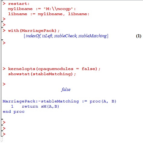 I have added the line of code that seemed the most straightforward to me. The name of the package I am loading is MarriagePack and the procedure I'm investigating is stableMatching. It is part of a file I have loaded called mccgp. Here is a screenshot.