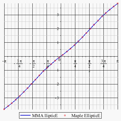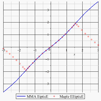 , legend=["MMA llipticE", "Maple EllipticE"]