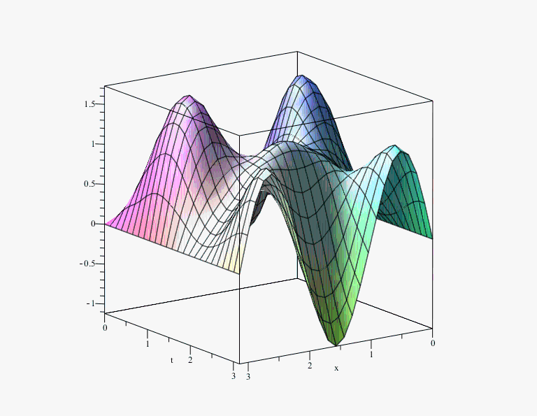 sol := pdsolve(pde, {bc, ic}, numeric);sol:-plot3d(x = 0 .. Pi, t = 0 .. Pi);