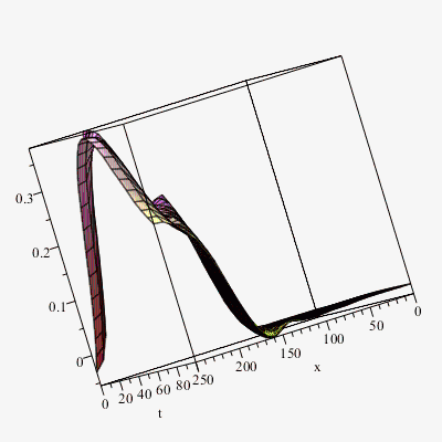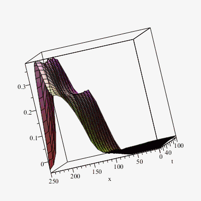 sol1(.5); pds2:-plot3d(x = 0 .. 250, t = 0 .. 100)