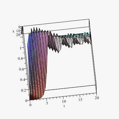 sol1(.5); pds1:-plot3d(x = 0 .. 250, t = 0 .. 100)