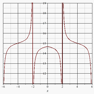proc (x, y) options operator, arrow; (sqrt(x^2+y^2)-4)/((sqrt(x^2+y^2)-2)*(sqrt(x^2+y^2)-6))+15 end proc