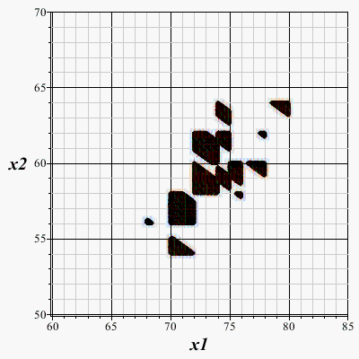 The attached uses no clever plotting (or any other) commands, just a couple of 'seq()' commands to cycle through possible values for x1, x2. Over the ranges 60 < x1 < 85,  50 < x2 < 70 it appears to give the same answers - althoug I would like to know how these ranges were obtained!!