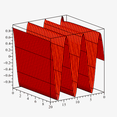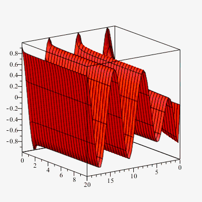 plot3d( 'eval'(v(x,t),sol3), x=0..20, t=0..20, color=blue);