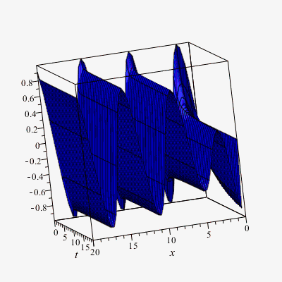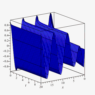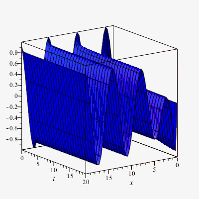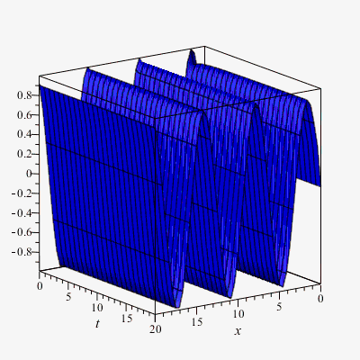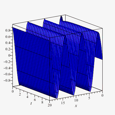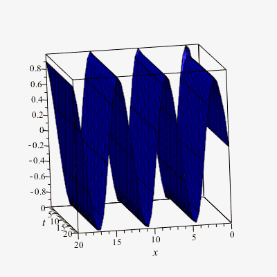 plot3d( 'eval'(u(x,t),sol3), x=0..20, t=0..20, color=blue);