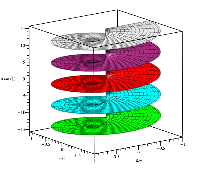 u=-Pi+2*k*Pi .. Pi+2*k*Pi, r=0..1,  labels=[Rez,Imz, 'Im(Ln(z))'], grid=[120,30], color=col[k+3], lightmodel=none), k=-2..2));