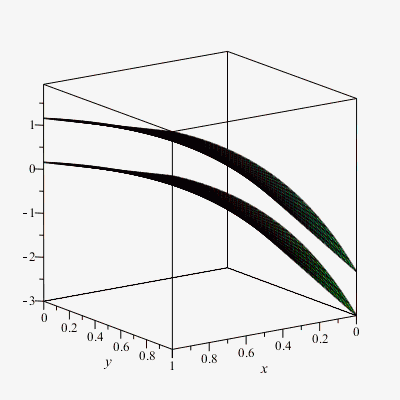 plot3d([F1(x,y), '1+F1_(x,y)'], x=0..1, y=0..1);